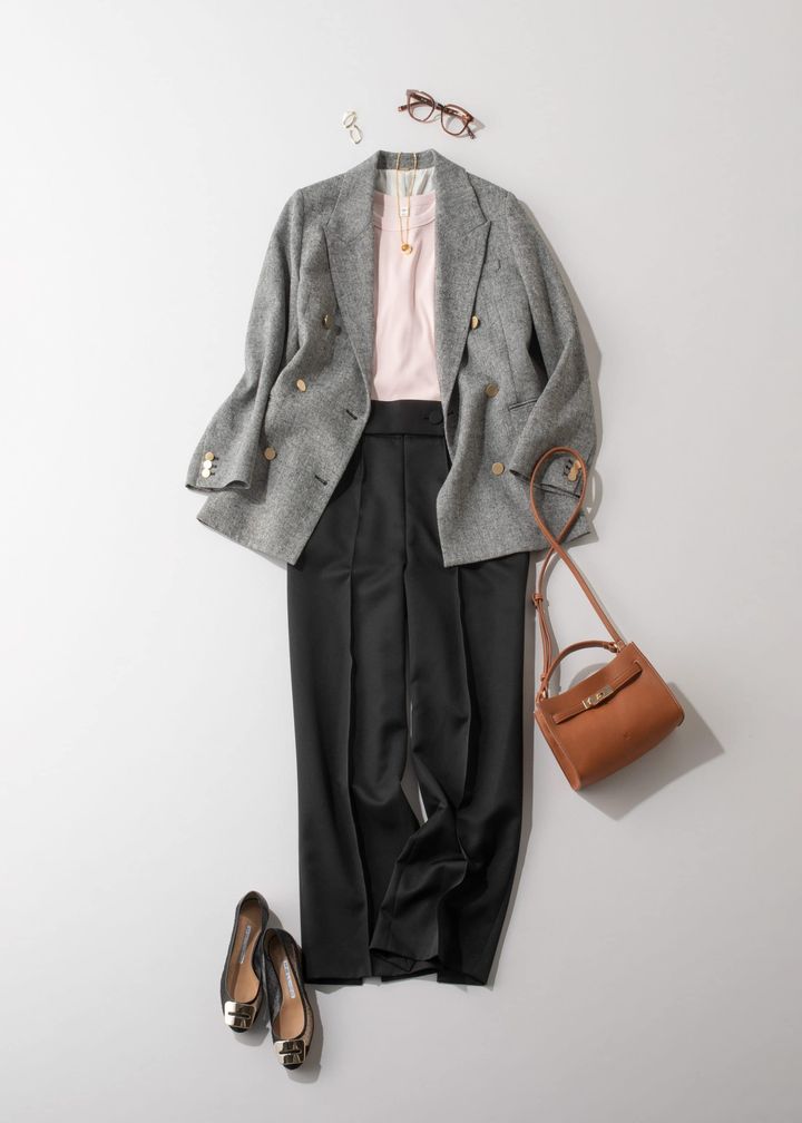 ニットは着回し。ジャケット¥49,500(サードマガジン)パンツ¥35,200(ハイク)バッグ¥13,200(ケッシュ ル エッセンシャル)シューズ¥2,990(GU)ソックス¥990※3色セット(ユニクロ)サングラス¥39,600(ブラン)ピアス¥24,200ブレスレット¥19,800(ともにウノアエレシルバーコレクション/ウノアエレ ジャパン)