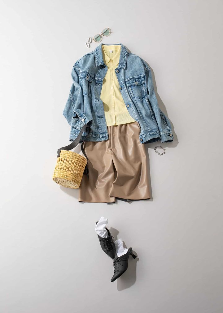 デニムジャケットをラフに羽織れば、こなれたカジュアルスタイルが完成。イエローにもマッチするキャメルのレザーショートパンツで、さらにおしゃれ感がUPします。