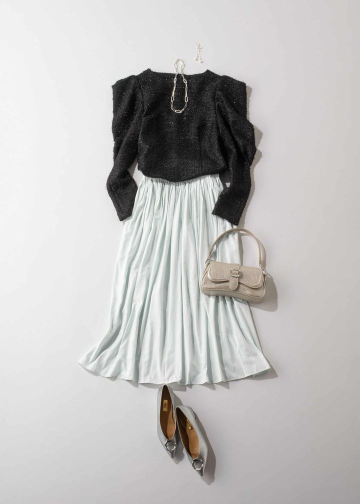 袖コンシャスなブラックのラメカットソーを合わせれば、リュクスなお出かけコーデに。小物は光沢感のあるシルバーやベージュを選んで上品な華やかさをプラスして。