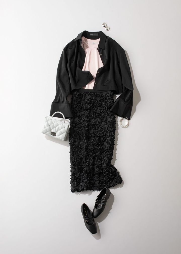 優しいピンクに切れ味の良いブラックを効かせたモードな着こなしは、ディナーなど夜のお出かけにおすすめ。短丈シャツに表情感のあるスカートを合わせれば、奥行きのある洗練されたムードに。