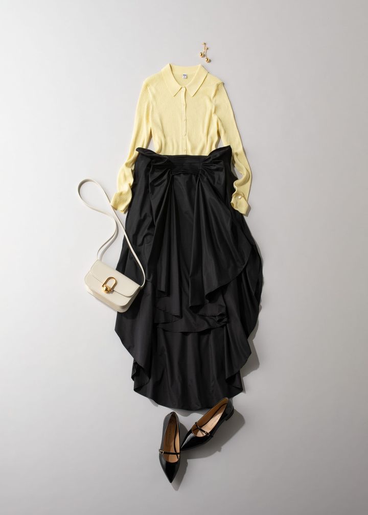 程よくフィット感のあるコンパクトなシルエットだから、ドラマチックなスカートと相性抜群。ボリュームたっぷりのティアードスカートを合わせて春のお出かけシーンを盛り上げて。