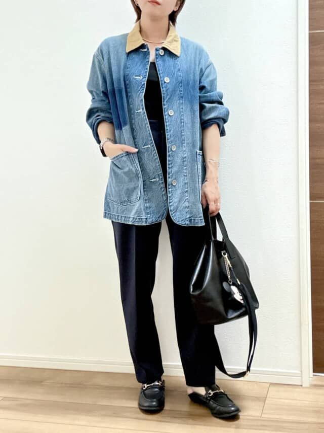 デニムジャケットは、ゆとりのあるオーバーシルエットを選ぶのがマスト。デニム初心者さんには、丈感が長めでシャツ感覚で着られるカバーオールタイプがおすすめです。今っぽさも存分に醸せます。