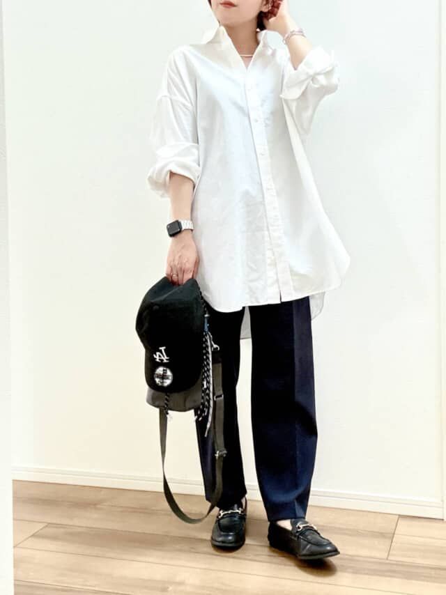 身幅が広いだけでなく、丈感もなるべく長めのものを選ぶのがポイント。ボタンは全部閉めずに、上と下を少し開けて着こなすことで、こなれ感もアップします。シャツもパンツもきちんと感があるので、キャップやナイロンバッグといったカジュアルアイテムでバランスを取りつつスポーティに外すと、オンとオフの差をしっかりつけられます。