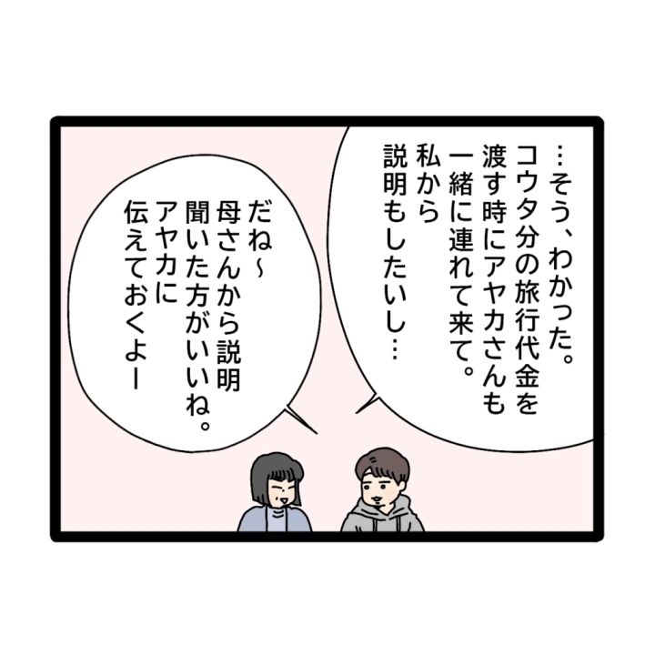 でも、「コウタ分の旅行代金を渡す時にアヤカさんも一緒に連れて来て。私から説明したいし・・」と話し、アヤカさんに伝えてもらうことに。コウタさんと笑顔で話していたものの、内心は怒りだらけ!「まったくもう!何をどう吹き込まれたのか・・」と今度アヤカさんが来た時に、私がお金を管理した方が良いってことを伝えないと!!」と心に誓いました。