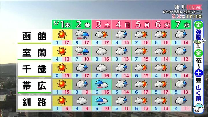 2日(金)の午後は道南から雨が降り、傘が差しにくくなるほどの風を伴います。3日(土)は道東を中心に雨が降り、4日日曜の日中は各地で雨が降るでしょう。5日(月)と6日(火)は晴れ間が出そうです。