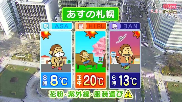 あす5月1日(木)の札幌です!朝昼晩の天気をもんすけでお伝えします!