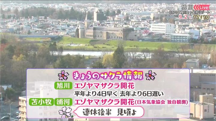旭川の常盤公園ではサクラが咲いているようには見えませんが…旭川地方気象台ではきょう30日(水)、平年より4日遅くサクラの開花を発表しました。また、日本気象協会の独自観測ですが、苫小牧と浦河でもサクラが開花しましたよ。連休後半は見ごろになりそうです。