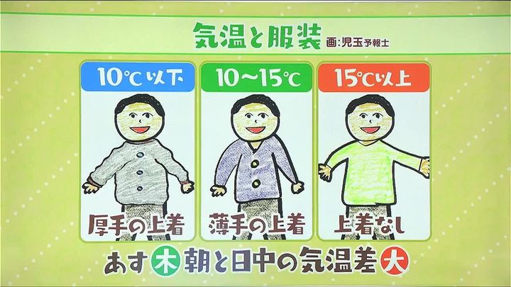 あす5月1日(木)は朝と日中の気温差が大きくなります。朝は厚手の上着が必要ですが、日中は上着なしで過ごせるところが多くなりそうですよ。あすは調節しやすい服装が必要ですね。