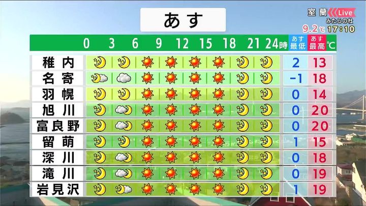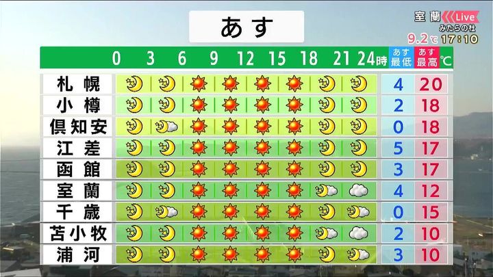 冷える朝は低い雲が広がりますが、日中は青空が広がります。内陸の上川や空知地方では朝と日中の気温差が20度くらい開くでしょう。