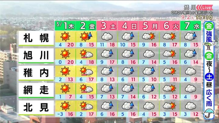 5月2日(金)は晴れても風が強まります。金曜の夜に札幌で雨が降り出し、3日(土)の午前にかけて各地で雨となります。3日(土)の午後は雨がやむでしょう。この先、雪が降る可能性は低い見込みです。