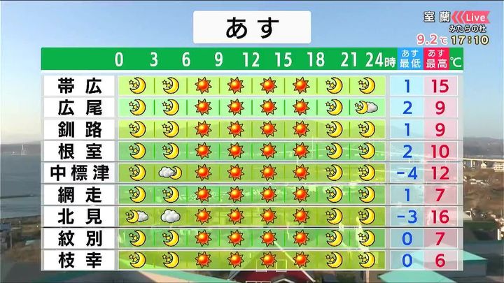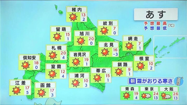 ただ、道東方面の海岸部は一ケタの寒さが続きます。そして最低気温は5度以下で北見は‐3度です。気温3度以下で霜がおりやすくなって、各地に霜注意報が出ています。農作物の管理に注意して下さい。