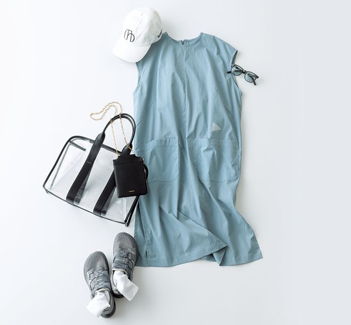 バッグは2個持ちが基本。スマホや貴重品は斜め掛けして持ち歩くように。そしてキャップは白、が顔映りが良くてオススメ。ワンピース¥28,600スニーカー¥30,800(ともにアンドワンダー)バッグ(ショルダー)¥26,400バッグ(クリア)¥35,200(ともにオルセット/オルサ)ソックス¥429(ファミリーマート コンビニエンスウェア/ファミリーマートお客様相談室)キャップ¥8,250(NO.b/AMARC LIFE STORE)サングラス¥41,800(ayame)