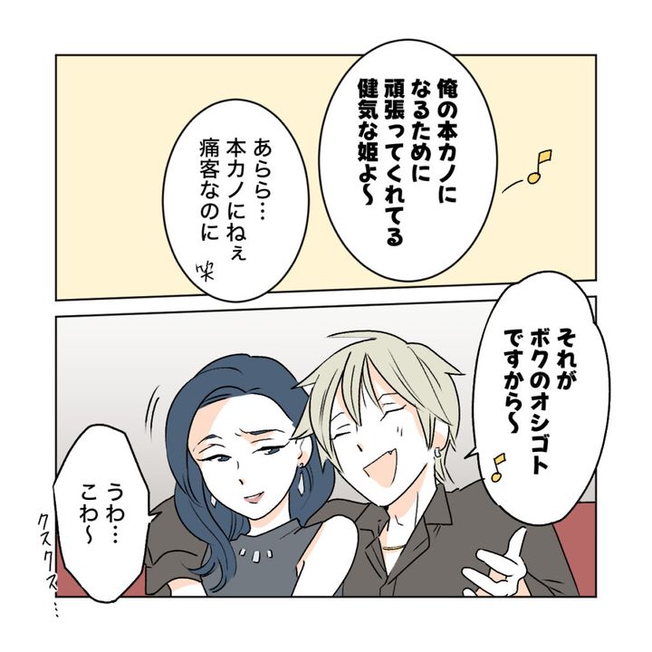 ルキくんはというと、隣にいる彼女らしき女性に、カズハさんのことを「俺の姫(痛客)」だと話し、「今の仕事がかなり稼げるみたいでさ~。俺の本カノになるために頑張ってくれてる」と二人でバカにしたように笑い合いました。