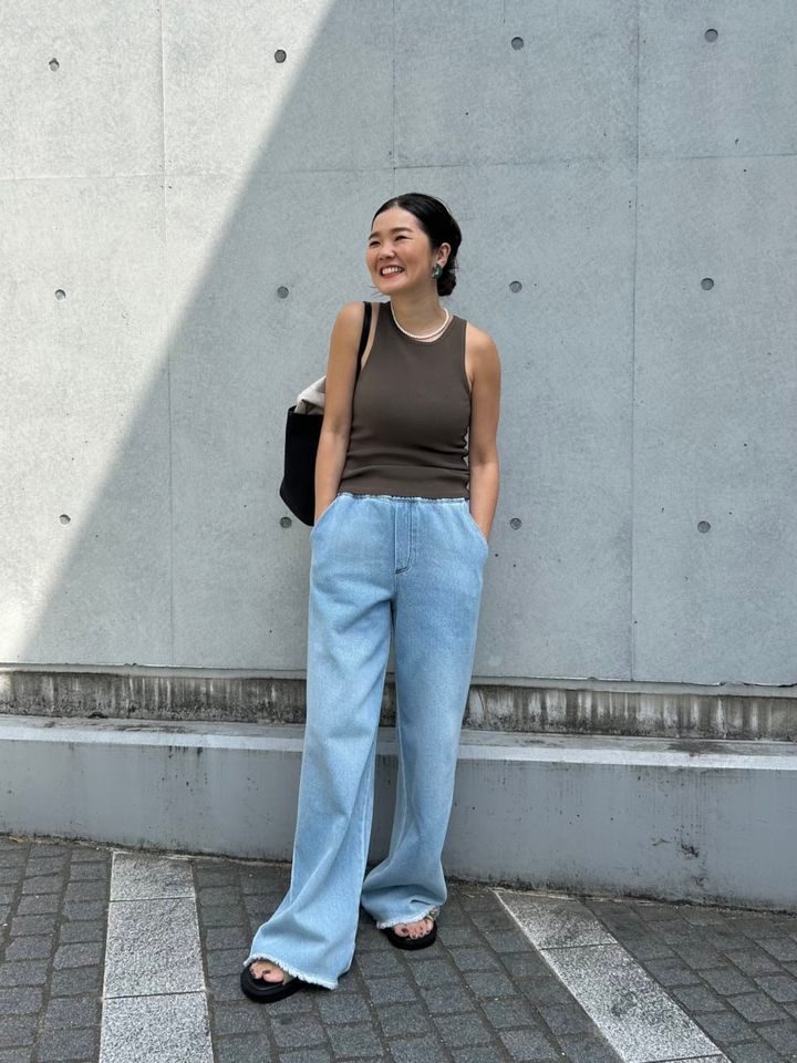 「バイイングの出張のときから気になっていた、ベルギーのブランド〈FACON JACMIN(ファソン ジャックマン)〉のデニム。近年“サステナブル”がキーワードに上がるなか、これは生産工程で使用する水の量を削減したウォータレスデニムであることもポイントが高いです。ウエストがイージーになっているので窮屈感がなく、ラフにはけるムードが気に入っています」デニム¥58,300(ファソン ジャックマン)、ブレスレット¥53,900(リエ スタジオ)、右手中指のリング¥15,400、左手中指のリング ¥13,200(共にフィリップ オーディベール/全てデミルクス ビームス 新宿)、その他は全て本人私物