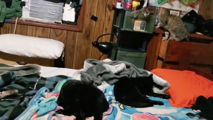 そんな物理法則を記録したのがこちらの映像であります。ベッドの上で思い思いの姿勢で毛づくろいする4匹の猫たち。画面右側のキジトラが何かに気づき、ベッド横の引き出しを確認しております。