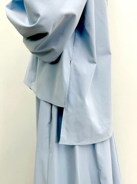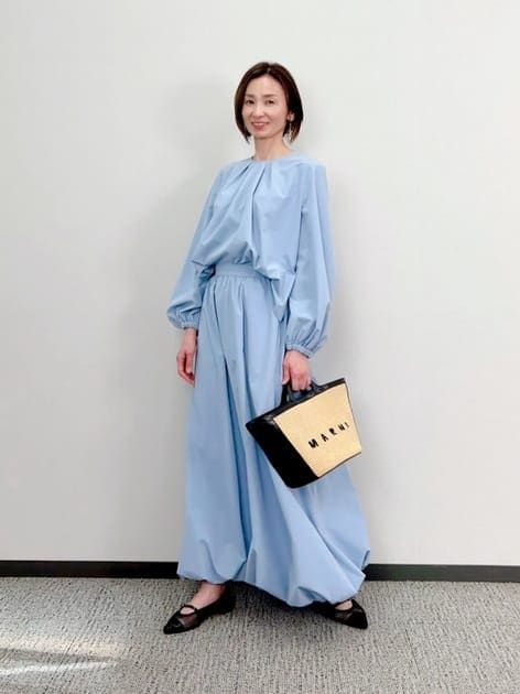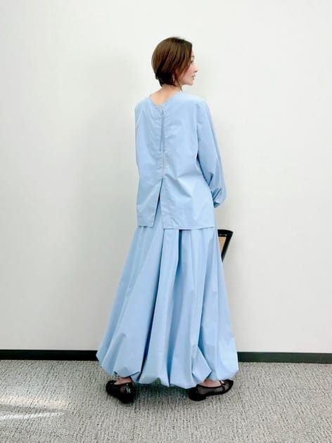 こちらの清涼感のある水色が目を惹くセットアップ。背中の長めリボンジップやアシンメトリーな裾のライン、ふんわりボリューム袖など、シンプルに見えて細部にこだわりのつまった一枚です。スカートはマキシ丈のバルーンシルエットで動きやすさと華やかさを両立。トップスはフロントだけインしてウエストマークすると◎。かごバッグを合わせて“爽やかさ×品のよさ”が絶妙にマッチする春のきちんとコーデの完成。