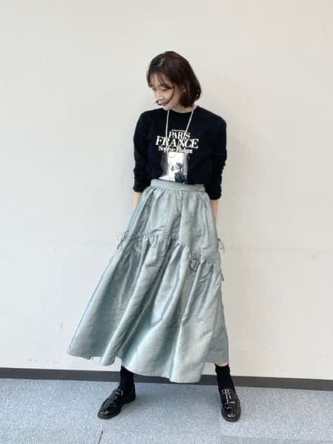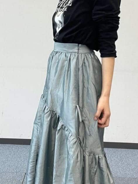 光沢感が美しいアイスブルーのスカートは、切り替えギャザーとサイドリボンがポイントの1枚。歩くたびにふわっと揺れる素材感がドラマティックで、大人の余裕と遊び心を感じさせます。フォトTで肩の力を抜いたトップスに黒小物で引き締めた足元が好バランス。甘さを中和して程よいモード感を漂わせました。ナイロン×ポリエステル素材が湿気の多い日でもまとわりつかず快適に着こなせるので、気温も気分も揺らぐ春先にこそ重宝できそう。