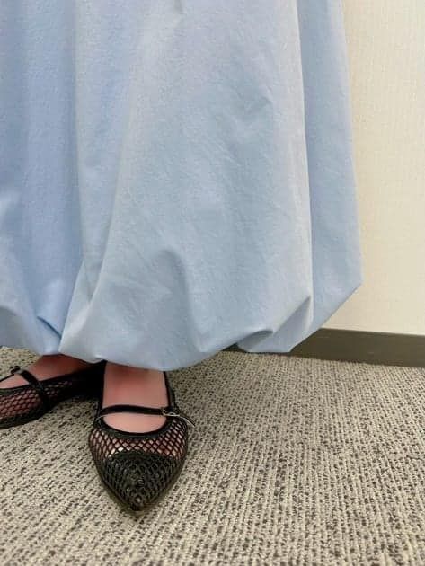 1.アイスブルーの“揺れ映え”スカートでほんのりモードに