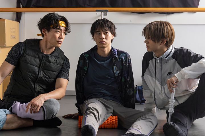 © 「バレエ男子!」製作委員会・MBS 小森川バレエ団に所属する中堅のバレエダンサー・小林八誠(戸塚純貴)と、ベテランダンサーのマモさん(大東駿介)、八誠と同期の真白(吉澤要人)は、練習の合間にたわいもない会話で盛り上がる仲良しメンツ。ある夜、八誠が警察官に職務質問されるトラブルが発生。その後、八誠が衝撃の告白をする。出演/戸塚純貴、大東駿介、吉澤要人 他 元バレリーナの女優・草刈民代がバレエ監修と指導を務める。5月1日(木)よりMBSドラマフィル枠にて放送スタート! ©