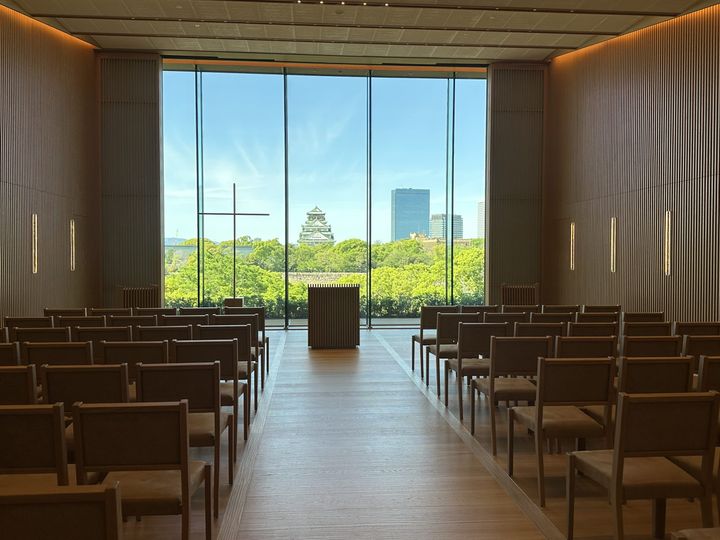 北側に緑豊かな大阪城公園、南側は難波宮跡公園を一望できる絶好のロケーション! 3階にある「パティーナチャペル」からは、この景色。大阪城の天守閣が目の前に見えるんです。また、大阪城の石垣をホテルの外壁や、和紙のモチーフにして客室のインテリアに取り込むなど、その土地の歴史や文化に敬意を表したデザインが館内のいたるところで見られるのも、同ホテルの特徴の一つです。