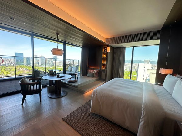 客室は全221室あり、料金は1室1泊85,000円~(税・サ別)。スタンダードな客室タイプのデラックスルームでも面積50㎡と、ゆったりした空間に。都市型ホテルには珍しく、角部屋には広々としたバルコニーも設置されています(写真はアーバンスイート)。そして全客室に、くつろげる畳エリアやヨガマットが用意されています。