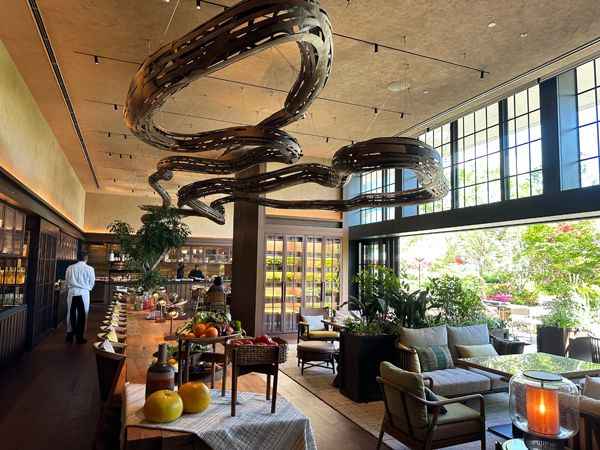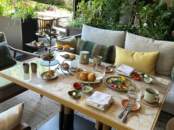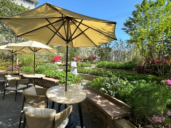 その1つ、1階エントランスを入ってすぐのシグネチャーレストラン「P72(ピーセブンティートゥー)」では、日本古来の暦「七十二候」をコンセプトに、季節の食材を使ったメニューを提供。料理の7割はプラントベースで、店内の水耕栽培ポットや、開放感ある屋外のテラス席の奥にあるガーデンでは、フレッシュなハーブが育てられています。