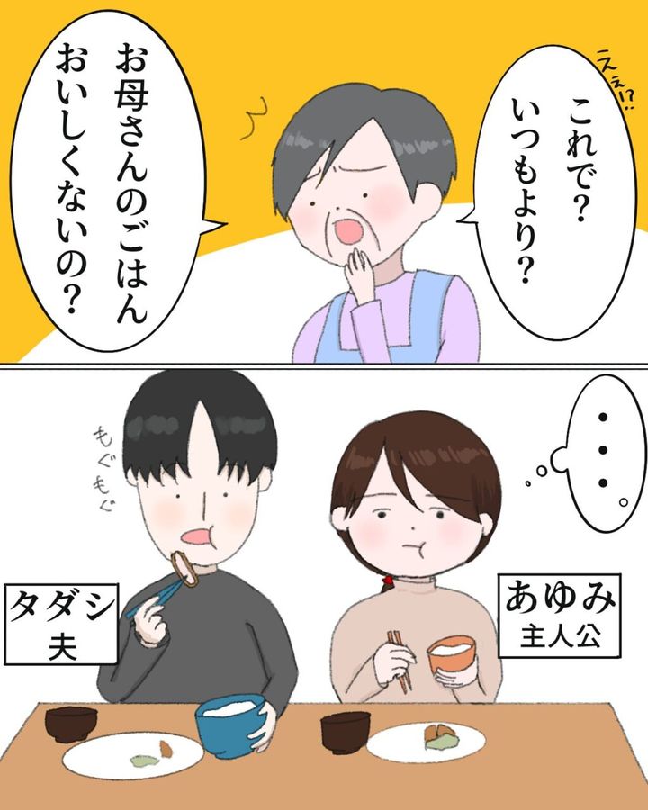 娘たちの言葉を聞いて、義母が「えぇ!?これで?いつもより?」と驚いた様子で言ったあと、娘たちの目の前で夫と並んで食事している私の前で「お母さんのご飯おいしくないの?」と、悪びれもせず言い放ちました。