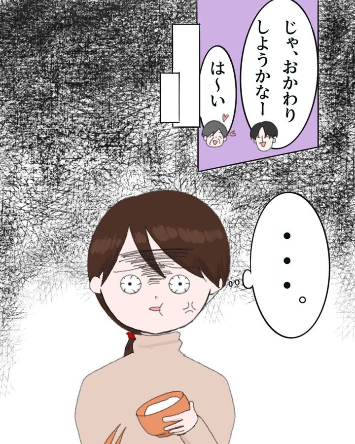 「じゃ、おかわりしようかなー」「はーい」そんな親子の幸せそうなやり取りを前に、イラッとしながらとにかく無になって食べ続ける私です。