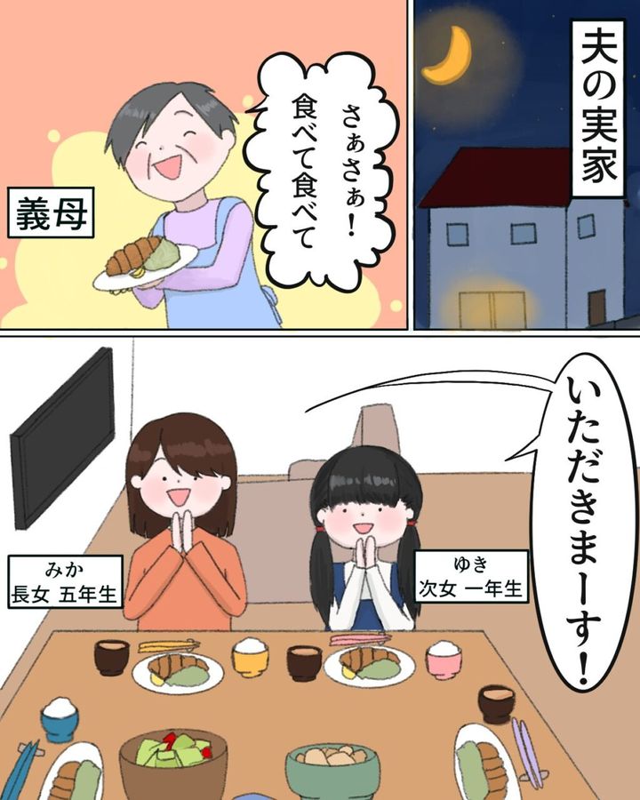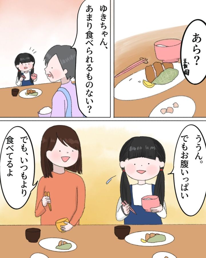 普段から食の細い小学1年生のゆき。5年生のみかに比べて食事の進みが遅いのを見て、義母が「あら?ゆきちゃん、あまり食べられるものない?」と心配そうに聞きました。ゆきが「ううん。でもお腹いっぱい」と言うと、みかは「でも、いつもより食べてるよ」とフォローしました。
