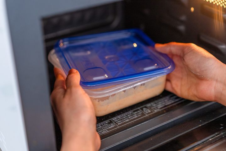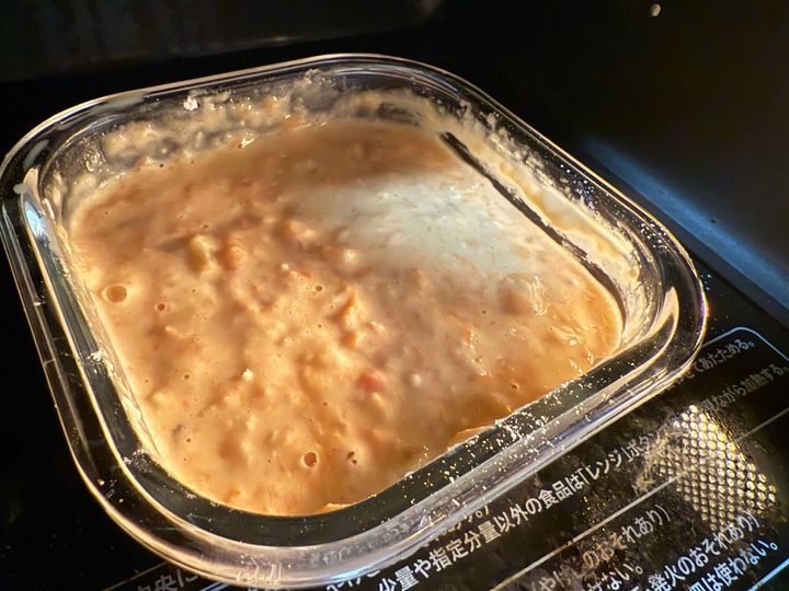 ⑤耐熱の蓋を少しずらしておき、電子レンジ600Wで約5分加熱する(火が通っていなければ追加加熱してください)。