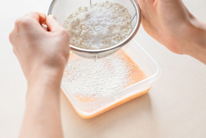④薄力粉、ベーキングパウダーをザルでふるって加え、よく混ぜる。