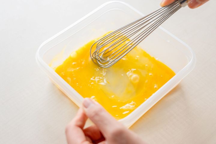 ③耐熱容器に卵を溶く。牛乳、油、①、②を加えて混ぜ合わせる。