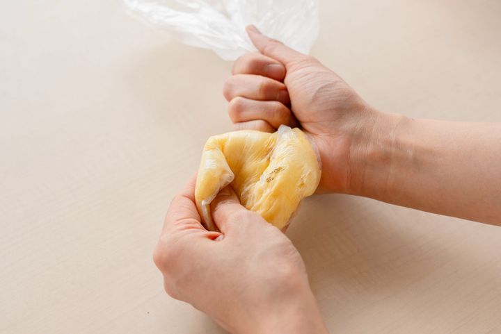 ①バナナは皮を剥き、ポリ袋に入れて潰す。