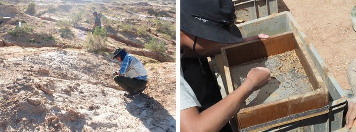 哺乳類化石産出層(左)と小型脊椎動物化石の取り出し作業(右)/ Credit: 岡山理科大学 – 恐竜時代に生きた新属新種の哺乳類化石をモンゴル・ゴビ砂漠で発見(2025)