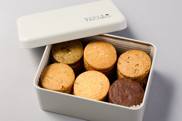 7年連続ミシュラン一つ星を獲得した予約困難店「TACUBO」が手掛けるドルチェ専門店「DOLCE TACUBO」。代官山と虎ノ門の2店舗を展開しています。昨年秋にリニューアルした6種類のフレーバーを詰め合わせたサブレ缶は、大人の味わいが詰まった一缶。ジャスミン茶×マーガオ、メープル×くるみ、ローズマリー×アッサルの塩、チーズ×黒胡椒、ナッツ×デュカ、チョコ×カルダモンなど、香りの個性が強いスパイスを独創的に掛け合わせ、焼き締めたような硬めの食感や歯ざわりまで計算され尽くした唯一無二の逸品。甘味は控えめでほどよい塩味のアクセントがあるので、お酒と一緒につまみたくなるようなスイーツ。甘いものが得意でない辛党の方にもおすすめです。