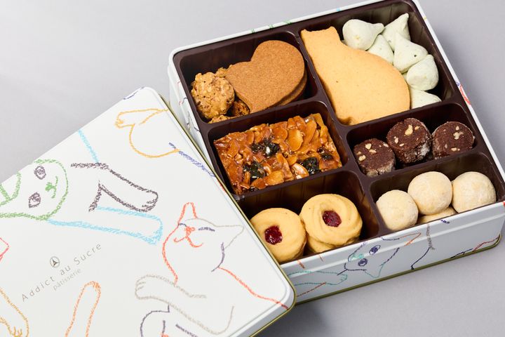 目黒区八雲の閑静な住宅街にたたずむ、フランス菓子を軸にしたパティスリー「アディクト オ シュクル」。遠方から訪れる人も多い人気店です。クッキー缶に描かれるイラストは、フランスや日本の名店で経験を積んだパティシエール・石井英美さんの愛猫がモチーフ。こちらのクッキー缶には、バターのうまみが口の中に広がる猫形のサブレナンテ、ほろ苦くて香ばしいサブレショコラ、ほろほろ口の中でとろける食感のブールドネージュなど、味わいも形も様々な計8種の焼き菓子がぎっしり詰め込まれています。小さなサブレ1枚1枚にしっかりとこだわりが込められ、少しずつ大切に食べたくなるような味わい深さと、猫のかわいらしさや優しい温もりが魅力的な一缶。通信販売はありませんが、店頭受け取り予約専用特設ページから事前注文が可能です。