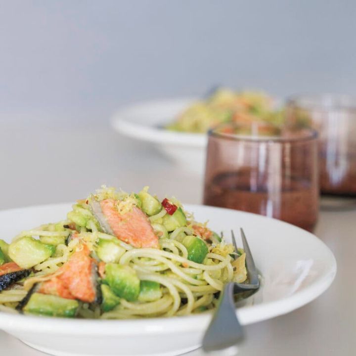 旨みたっぷりの“鮭×アボカド”に、レモンをプラス。酸味とほろ苦さが効いた、軽やかな味わいのパスタに。