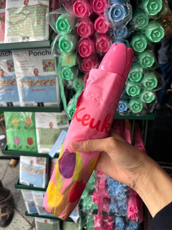 キューケンホフオリジナルグッズは、ここでしか買えないと大人気! 持ち手がチューリップになっている折り畳み傘は8.95ユーロ(約1,452円)