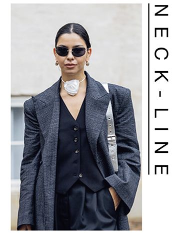 シャープなVライン、穏やかなクルーネックなど。ときにわかりやすいデザイン以上に人物像を左右する首まわりを、モチーフアクセで飾りつけ。ヘアは「印象をそぎ落とす」ことに徹すると、首まわりの存在感がきわ立つ。