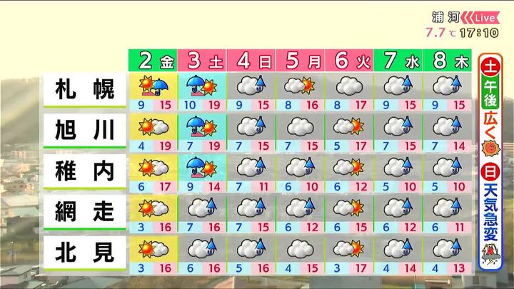 3日(土)の雨は札幌で朝まで、その他も昼過ぎには広くやむでしょう。4日(日)の日中は雨の強まることがありそうです。雪が降るような寒さはないでしょう。