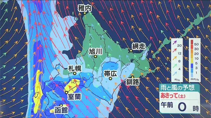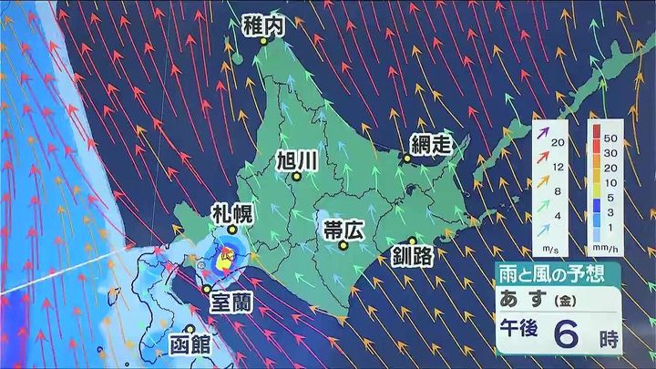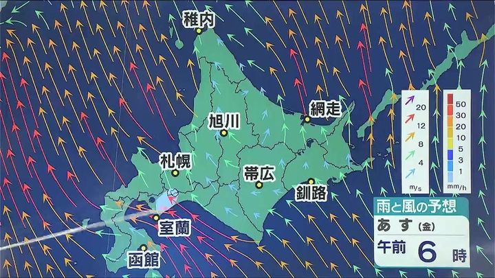 5月のスタートは五月晴れ。札幌で穏やかに晴れるのは2週間ぶりでした。ただ、あす2日(金)は天気が下り坂。そしてポイントなのが、風が強まることです。あすの雨と風の予想です。午前6時で、すでに札幌周辺など道央やオホーツク海側では赤い矢印、10メートル以上の南風が吹き、胆振の山沿いでは雨が降ります。