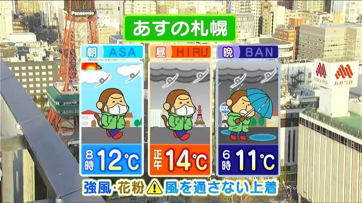あすは風が強くて、夜は雨ですね。歩きにくくなるほどの強い風、花粉にも注意して下さい。気温は10度を超えますが、風の影響で暖かさはあまり感じられません。風を通しにくい厚手の上着がオススメです。