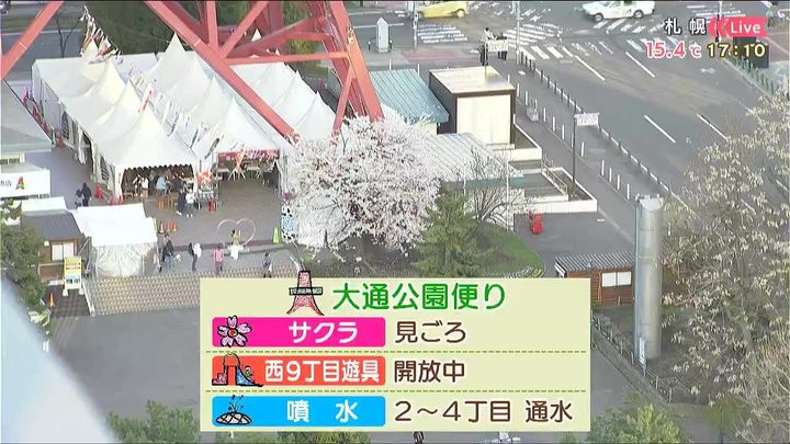 ここで大通公園便りです。見ごろのサクラ、あす2日(金)の風にも耐えてほしいですね。大通公園のHPによると、西9丁目の遊具は点検が終わって、今週から解放されています。2丁目から4丁目では噴水も楽しめます。
