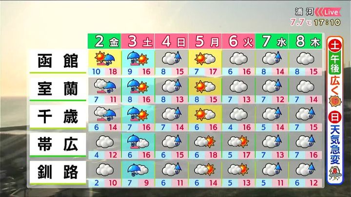 3日(土)は道南で午後は晴れますが、道東は3日日中いっぱい雨の降るところがあるでしょう。4日(日)は雨が降りやすいですが、5日(月)と6日(火)は晴れる見込みです。