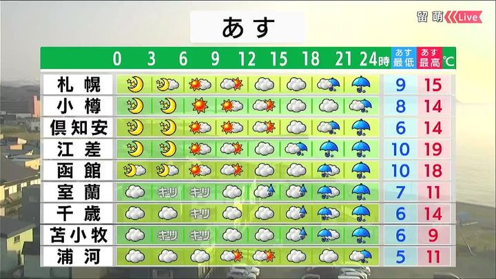 胆振地方は朝から霧がかかり、夜は雨が強まるでしょう。札幌は晴れますが、風が冷たく、夜は雨具が必要です。江差は19度で暖かさが続きます。