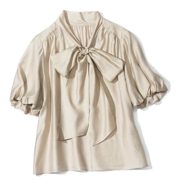 ほんのり光沢を帯びたベージュは、派手じゃないのに華やぎ充分。落ち感あるボウタイと、ふんわりバルーン袖で女っぽく。