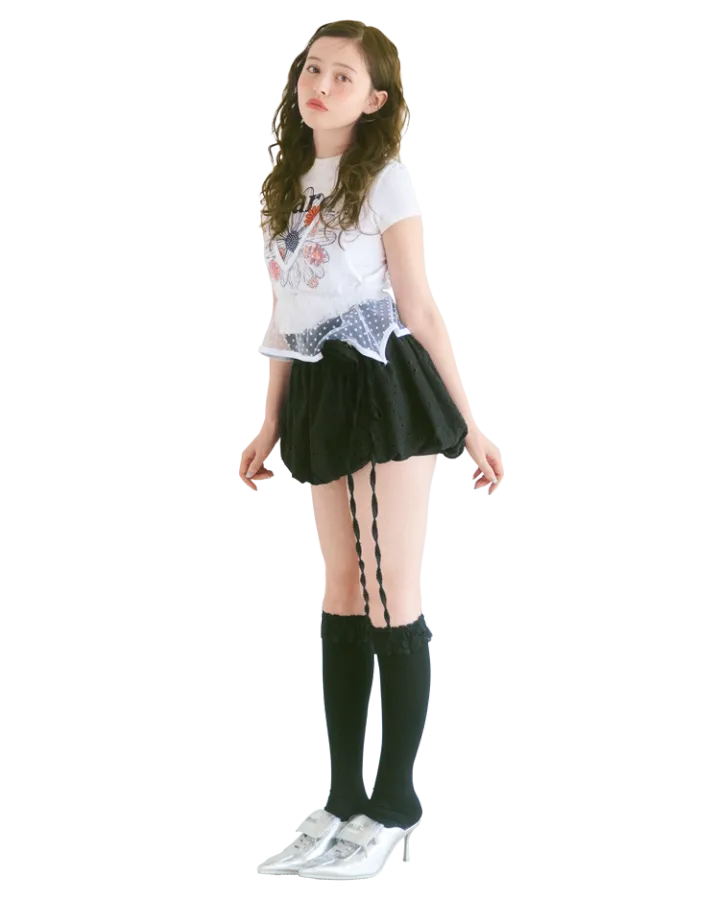 シアードットキャミソール 3,390円/NADIA FLORES ENEL CORAZON クロップドTシャツ 6,600円/Mardi Mercredi(MARDI MERCREDI JAPAN) ローズコサージュつきバルーンスカート 16,390円/クランク(HANA KOREA)ソックス 869円/チュチュアンナ スニーカーミュール 22,000円/YELLO