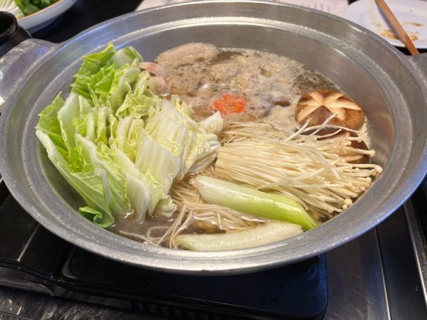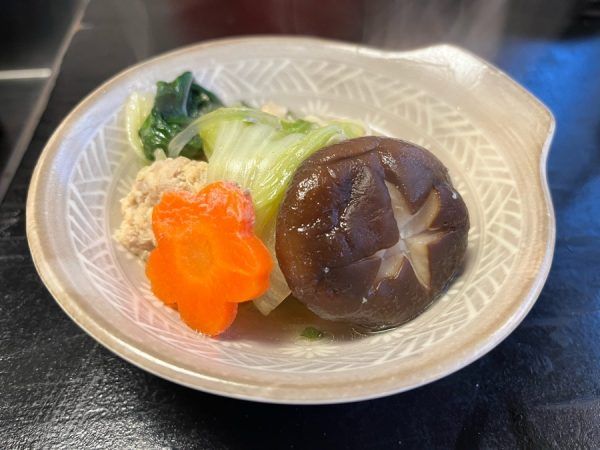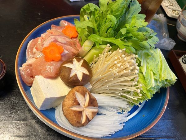 ダシが沸騰すると椎茸、人参、豆腐、薩摩地鶏の骨付きぶつ切り、豚バラ、軟骨入りの鶏肉、アカウオ、えのき、白菜や春菊等の野菜を鍋に入れてくれます。お肉たっぷりです!