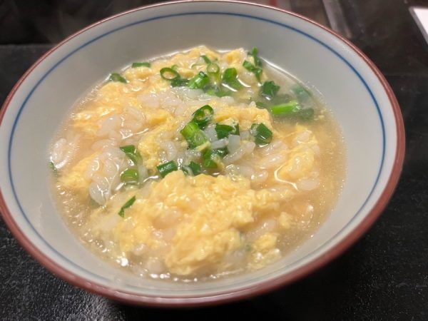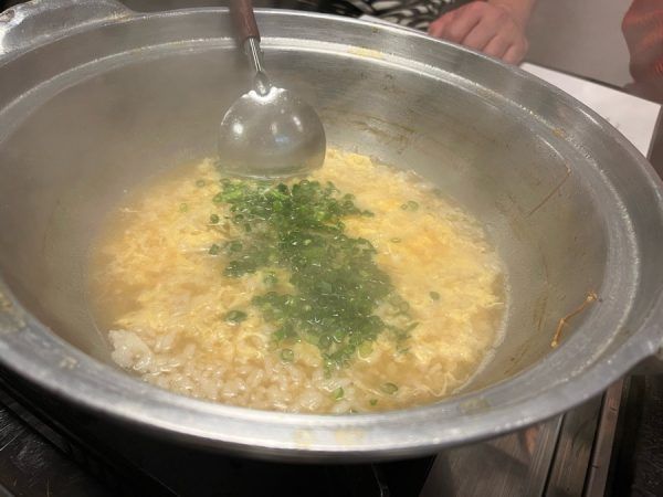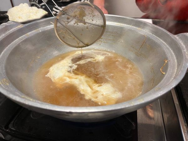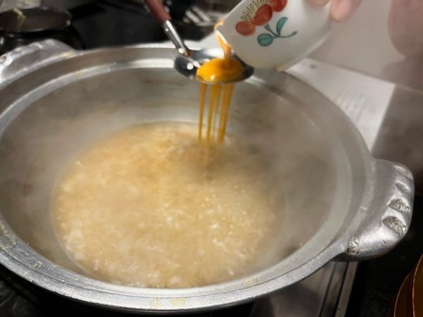 鍋が落ち着いた頃、雑炊の準備をしてくれます。 鍋の残りをすくいあげ、だし汁を沸騰させ、卵の白味を入れて取り出します。