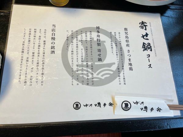 食事は天ぷらコース、炭焼きコース、もつ鍋コースや博多名物水炊きコース、ふぐ料理コース、すき焼コースなどもありますが、今回は一番人気の「寄せ鍋」コースを頂きました!